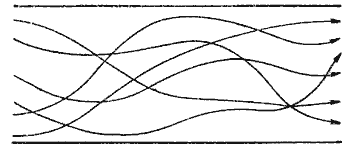Как было указано в п.4.1, для турбулентного течения характерно перемешивание жидкости, пульсации скоростей и давлений. Если с помощью особо чувствительного прибора-самописца измерять пульсации, например, скорости по времени в фиксированной точке потока, то получим картину, подобную показанной на рис.4.4. Скорость беспорядочно колеблется около некоторого осредненного по времени значения υ оср, которое данном случае остается постоянным. Характер линий тока в трубе в данный момент времени отличается большим разнообразием (рис.4.5).