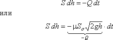 Рис. 5.10. Схема опорожнения резервуара Обозначим переменную высоту уровня жидкости в сосуде за h, площадь сечения резервуара на этом уровне S, площадь отверстия Sо, и взяв бесконечно малый отрезок времени dt, можно записать следующее уравнение объемов: