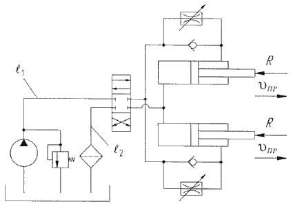 Рис.7.8. Гидросхема привода поворота стрелы Принцип работы гидропривода заключается в следующем. Из бака рабочая жидкость (масло) забирается насосом и подается к гидрораспределителю. В нейтральном положении золотника гидрораспределителя при работающем насосе на участке трубопровода между насосом и распределителем начинает увеличиваться давление, при этом срабатывает предохранительный клапан и жидкость сливается обратно в бак. При смене позиции золотника (нижняя позиция на схеме) открываются проходные сечения в гидрораспределителе, и жидкость начинает поступать в полости нагнетания гидродвигателей (поршневые полости гидроцилиндров). Из штоковой полости гидроцилиндров масло по гидролинии слива проходит через регулируемые дроссели, гидрораспределитель и, очищаясь фильтром, попадает на слив в бак. Скорость поступательного движения штоков гидроцилиндров регулируется дросселями. Реверсирование движения штоков осуществляется путем переключения позиций гидрораспределителя. При обратном движении штоков без нагрузки их скорость не регулируется и зависит от расхода рабочей жидкости в штоковые полости. При аварийной остановке штоков (например, непреодолимое усилие) давление в системе возрастает, вызывая тем самым открытие предохранительного клапана и сброс рабочей жидкости в бак.