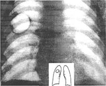 Рис. 11 Врожденная киста верхней доли правого легкого: определяются четкие контуры воздушного образования Осложнение врожденных кист распределяют таким образом: нагноение кисты - 60%, напряжение кисты - 20%, прорыв в плевральную полость - 5%. На кисты с бессимптомным течением приходится 15%. Нагноение кисты возникает в любом возрасте и сопровождается ухудшением общего состояния, повышением температуры тела до высоких цифр, интоксикацией, ознобом, лейкоцитозом. На рентгенограмме (Рис.12) обнаруживают полость круглой формы с уровнем жидкости.
