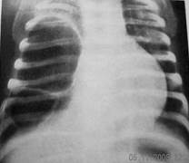 Клиника. При обследовании ребенка обнаруживают отставание половины грудной клетки в акте дыхания на стороне поражения. Перкуторно над легочным полем определяется тимпанит, границы сердца смещены в здоровую сторону. Данные объективного исследования не позволяют исключить напряженный пневмоторакс, но во время рентгенологического исследования обнаруживают контуры кисты, иногда наличие в ней перепонок. Напряженный пневмоторакс является легочно-плевральной формой острой гнойной деструкции легких с продолжительным тяжелым течением и выраженной интоксикацией. Дифференциальная диагностика. Напряженную кисту легких надо отличать от врожденной частичной эмфиземы, которая рентгенологически характеризуется обедненностью легочного рисунка, повышенной прозрачностью легочной паренхимы, чаще всего в области верхней доли левого легкого и выраженным смещением органов средостения и сглаживанием купола диафрагмы. Разрыв осложненной кисты приводит к пневмотораксу, пиотораксу или пиопневмотораксу. Дифференциальный диагноз с легочно-плевральными формами ОГДП в этом случае затруднен. Поэтому необходимо учитывать анамнез, клиническое течение заболевания. Лечение врожденных кист только хирургическое после установления диагноза. Если выявлена напряженная киста, перед операцией показано проведения пункции и дренирование кисты с целью уменьшения внутригрудного давления. Объем оперативного вмешательства определяется размерами и распространением кистозного образование. В случае кист небольшого диаметра выполняют цистоэктомию, среднего - сегментарную резекцию легкого, а если диаметр кисты превышает поперечный размер воздушной доли легкого, показана лобектомия, иногда с резекцией язычковых сегментов легких.