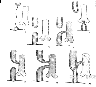 Рис.1 Пищевод и трахея в начальных отделах первичной кишечной трубки а. Зона будущего пищевода б. Трубчатый вырост-трахеи в. Раздвоение трахеи г, д. Образование пищевода е. Нарушение реканализации Атрезии пищевода и диафрагмальные грыжи имеют аутосомно-рецесивный тип наследования, когда оба родителей оказываются носителями рецесивного гена (гетерозиготы): возможность рождения здорового ребенка - 25 %, больного - 25 %, гетерозигота - 50 %. Брак больного со здоровым будет давать в потомстве 100 % гетерозигот. Брак больного с гетерозиготой дает в потомстве 50 % больных и 50 % - гетерозигот (носителей). Существуют разнообразные анатомические варианты этого порока. В " Атласе атрезии пищевода" D.Kluth (1976) описано 97 видов и " подвидов" атрезии пищевода. Чаще встречаются такие виды патологии пищевода (Рис.2).