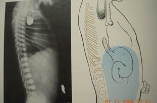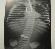 Рис.2 Вид патологии пищевода: а. Аплазия пищевода, б. Атрезия пищевода без трахеопищеводного свища в. Атрезия пищевода с нижним трахеопищеводным свищем г. Атрезия пищевода с бифуркационным свищем д. Атрезия пищевода с верхним трахеопищеводным свищем е. Атрезия пищевода с двумя трахеопищеводными свищами ж. Атрезия пищевода с нижним трахеопищеводным свищем и наличием общей мышечной стенки между сегментами пищевода. Но, в основном, выделяют два классических вида атрезии пищевода: 1. Оральный сегмент заканчивается слепо, а желудочный - соединенный с дыхательными путями; 2. Оральный и дистальный сегменты заканчиваются слепо и не соединяются с дыхательными путями. Атрезия верхнего приводного сегмента с образованием нижним трахеопищеводным свищем, являются частым пороком развития пищевода - его диагностируют в 85-95 % больных. Независимо от вида атрезии оральный сегмент пищевода всегда более расширен, чем нижний, желудочный. Стенка верхнего конца утолщена, гипертрофирована. При атрезии пищевода наблюдается характерная клиническая картина. Уже через 2-3 часа после рождения верхний оральный слепой мешок пищевода и носоглотка заполняются слизью, вследствие чего у новорожденного появляются пенистые выделения изо рта и носа. Это ранний симптом. Ложная гиперсаливация обусловлена тем, что в процессе дыхания вязкая слизь выдыхается и забросается в носоглотку. После отсасывания слизи она снова быстро накапливается и часть ее аспирируется. Возникают приступы асфиксии, поэтому уже к концу 1 суток после рождения появляются одышка, цианоз носогубного треугольника, прослушивается большое количество влажных разнокалиберных хрипов. Во время кормления приступ цианоза усиливаются. Эти симптомы свидетельствуют о нарушении проходимости пищевода. Возникает нарушение дыхания вследствие ателектазов и пневмонии, развивается идиопатический респираторный дистрес-синдром (РДС). Если верхний отрезок пищевода соединяется с трахеей, в клинической картине будут преобладать нарушение дыхания, поскольку содержимое верхнего отрезка пищевода попадается через свищ в трахею. Наличие нижнего трахеопищеводного соединения диагностируют во время осмотра и перкуссии живота. При отсутствии соединения живот запавший, перкуторно определяется тупой звук. При наличии свища желудок и кишечник заполнены воздухом. В результате антиперистальтики кислое содержимое желудка забросается в трахею и бронхи, происходит гибель мерцающего эпителия и нарушение дренажной функции бронхов. Перистальтика пищевода при атрезии с трахеопищеводным свищом нарушено. Кроме того, растянутый амниотической жидкостью верхний сегмент пищевода сжимает трахею, которая может привести к трахеомаляции. Низкое внутриутробное интрабронхиальное давление замедляет процесс расширения бронхов и альвеол. Диагностика классических пороков не сложна, особенно, если нет сопутствующих пороков развития. Есть несколько методов диагностики: зондирование пищевода с помощью тонкого резинового катетера (№ 8-10). Эта процедура должна выполняться в родильном зале. Если это не информативно, через катетер вводят воздух (10-20 мл.) (проба Элефанта), который выделяется через нос и рот. Ребенок должен переводиться в хирургический стационар. Наиболее информативным есть контрастирование пищевода контрастн