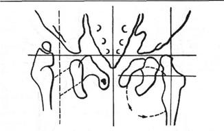 На обзорной рентгенограмме таза через оба тазобедренных сустава проводят линию Келлера, потом вертикальную линию, которая распределяет таз на две симметричных половины. Через крайнюю внешнюю точку головки здорового бедра проводят касательную вертикальную линию. С другой стороны на такой же расстоянии от средней вертикали проводят третью вертикальную линию. Все линии должны быть параллельными между собой и перпендкулярными к линии Келлера. Скошенность " крыши", высокое положение бедра и его латеропозиция выражены значительно. У детей старшего возраста для диагностики патологии тазобедренного сустава широко применяют схему Омбредана (рис. 11).