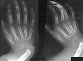 Рис.5. Рентгенограмма ребенка с лучевой косорукостью. Дефект может быть двусторонним. Одновременно недоразвиты мышцы предплечья с лучевой стороны, первый палец кисти, кости запястья. Кисть наклонена в сторону лучевой кости (вовнутрь), функция ее резко нарушена, а в связи с отсутствием первого пальца кисти невозможен захват предметов. Лечение врожденной косорукости включает много этапов. Уже сразу после рождения ребенка назначают массаж, лечебную физкультуру. Для исправления контрактуры суставов накладываются гипсовые повязки. Первая операция выполняется в возрасте 2 лет. Потом могут понадобиться дополнительные оперативные вмешательства. Хронический подвывих кисти (болезнь Маделунга). Это редкая аномалия, при которой возникает недостаток развития области лучезапястного сустава. Деформация прогрессирует постепенно и до 12-14 лет становится заметной. Боли при этом заболевании нет. Возникает штыкообразное искривление кисти, которое постепенно нарастает. Ограничиваются движения в лучезапястном суставе. Лечение оперативное. Выполняют резекцию участков костей, со следующей их фиксацией спицами. Потом накладывают гипсовую повязку на один месяц, после чего назначают физиотерапию и лечебную физкультуру. Синдактилия. Это аномалия развития при которой есть сращения полное или неполное одного или нескольких пальцев кисти между собой. Классификация синдактилии