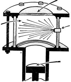 Рис. 1.2. Камера Вільсона У радіаційно-гігієнічній практиці і медичній радіології набули широкого застосування лічильники заряджених частинок. У залежності від принципу дії існують лічильники іонізаційні, напівпровідникові (кристалічні), сцинтиляційні, черенківські. У зв'язку із особливостями напівпровідникових, сцинтиляційних та черенківських лічильників найчастіше виділяють відповідно напівпровідниковий, сцинтиляційний та черенківський методи реєстрації іонізуючих випромінювань. Принцип роботи лічильника Черенкова — сцинтиляційний, але замість люмінофору використовується речовина, в якій під впливом випромінювання вибиваються швидкі електрони (видиме черенківське випромінювання). Зупинимося на кожному з них окремо. Іонізаційний принцип реєстрації лежить в основі роботи іонізаційних лічильників. До них відносяться пропорційні лічильники і лічильники з самостійним розрядом — лічильники Гейгера—Мюллера. Це газонаповнені торцеві або циліндричні конденсатори-лічильники, які реєструють кожну заряджену частинку, що потрапила в лічильник (Рис. 1.3).