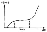 Рис. 1.3. Газорозрядні лічильники: а)торцевий; б)циліндричний Напівпровідникові (кристалічні) лічильники — це теж іонізаційні лічильники, в яких частинка, що пролітає, породжує електрони провідності та «дірки» у напівпровіднику. Невеликих розмірів пластинки, зроблені із сірчаного кадмію (CdS), сірчаного цинку (ZnS), алмазу, хлористого срібла (AgCl), германію, кремнію та інших, включаються у спеціальну радіотехнічну схему. На пластинку спрямовується потік частинок, який слід виміряти. Частинка, яка проникає у напівпровідник, породжує в ньому велику кількість носіїв струму: електронів провідності та «дірок». Напівпровідник стримує провідність, яка миттєво вплине на зростання електричного струму. Вимірювальний прилад проградуйований так, що він покаже не силу струму, а кількість частинок, які потрапили на пластинку. За кількістю зареєстрованих імпульсів роблять висновок про кількість частинок, що потрапили на пластинку. Простота пристрою та експлуатації, малі розміри, висока чутливість, швидке зростання імпульсу струму є перевагою кристалічних лічильників. Лічильники газорозрядні мають зовнішній циліндр і тонку металеву натягнуту по осі циліндра та ізольований від нього проволку. На лічильник подається напруга порядку 1000 - 1400 В. Лічильник на 90% заповнений парами ізопентанового спирту(10%). Тиск — 50-100 мм.рт.ст. Заряджена частинка, що потрапила у лічильник, утворює велику кількість пар іонів. Первинні іони (електрони) у сильному електричному полі набувають такої енергії, що починають іонізувати газ у лічильнику і створювати в ньому велику кількість вторинних іонів — газовий розряд, який в електричному ланцюгу дає імпульс струму. Кількість газових розрядів пропорційна кількості частинок, що потрапили в лічильник. Існує важливий показник лічильника — розрізнювальна спроможність — це кількість імпульсів, яку здатний зареєструвати лічильник за 1 сек. Вона залежить від конструкції та робочої напруги. Звичайно лічильники працюють у режимі, який знаходиться усередині «плато» (зона Гейгера), коли кількість імпульсів залежить лише від кількості іонізуючих часток або гамма квантів, що попали на детектор і мало залежить від зміни напруги (Рис. 1.4).