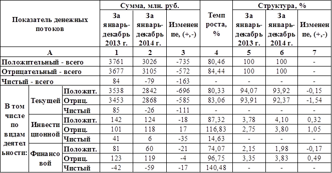Если показатели положительного и отрицательного денежного потока увеличиваются из года в год и при этом чистый денежный поток остается положительным, это говорит о том, что предприятие развивается, повышается спрос и предложение на товары или услуги предприятия. В случае предприятия «СТАРПОМ» 2014 г. оказался убыточным. Отрицательный денежный поток превысил положительный на 79 млн. руб. В 2013 г. ситуация была более благоприятная: чистый денежный поток оказался 84 млн. руб., при положительном денежном потоке равном 3761 млн. руб. Самую большую долю в формировании денежного потока предприятия имеет текущая деятельность, благодаря которой предприятие имеет возможность принимать участие в инвестиционной и финансовой деятельности. Доля денежного потока от текущей деятельности как за 2013 г., так и за 2014 г. превышает 90% от совокупного денежного потока предприятия. За 2013 г. положительный денежный поток составил 3538 млн. руб., что превышает данный показатель за 2014 г. на 696 млн. руб. Отрицательный денежный поток за 2014 г. также оказался меньше этого показателя за 2013 г. на 585 млн. руб. и составил 3453 млн. руб. в 2013 г. И соответственно чистый денежный поток по текущей деятельности за 2013 г. превысил данный показатель за 2014 г. на 111 млн. руб. В 2014 г. последний оказался -26 млн. руб. Денежные потоки по инвестиционной деятельности на ЧП «СТАРПОМ» в среднем составляют от 2 до 4%. Положительный денежный поток по инвестиционной деятельности составил 142 и 124 млн. руб. за 2013 и 2014 гг. соответственно. Один из показателей, который увеличился в 2014 г. по сравнению с 2013 г. это отрицательный денежный поток. Его темп роста составил 116, 83%, а в денежном выражении – 118 млн. руб. в 2014 г. Чистый денежный поток по инвестиционной деятельности сократился в 2014 г. по отношению к 2013 г. на 35 млн. руб. и составил 6 млн. руб. в 2014 г. Денежные потоки по финансовой деятельности составляют примерно такую же долю, как денежные потоки по инвестиционной деятельности в совокупном денежном потоке (от 2 до 3, 8%). Чистый денежный поток по финансовой деятельности отрицательный как в 2013 г., так и в 2014 г. (-42 млн. руб. и -59 млн. руб. соответственно). Его темп роста оказался 140, 48%.