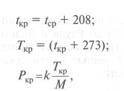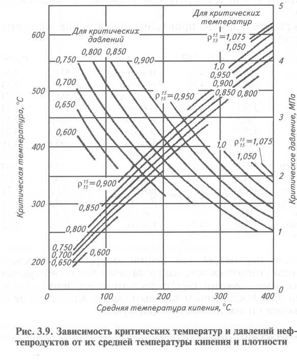 Температура, давление и объем при критическом состоянии очень важны для физики нефти, особенно в связи с современными высокотемпературными процессами при высоком давлении. Критическим состоянием вещества называется такое, при котором исчезает различие (граница) между его жидкой и паровой фазами, т. е. они имеют одни и те же основные свойства. Для каждого вещества существует такая температура, выше которой оно никаким повышением давления не может быть переведено в жидкость. Эта температура называется критической температурой Ткр. Давление насыщенных паров, соответствующее критической температуре, называется критическим давлением Ркр. Объем паров при критической температуре и давлении называется критическим объемом. Ниже в качестве примера приведены критические параметры некоторых веществ: Критические параметры для нефтяных фракций, состоящих из большого числа углеводородов, часто называются псевдокритическими, т. е. критическими точками такого чистого компонента, для которого соотношения Т-Р- V идентичны таковым смеси. Критические параметры определяются по эмпирическим формулам: для алифатических углеводородов