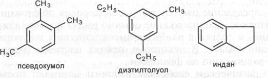 Соотношение гомологов бензола в бензиновых фракциях: С6: С7: С8: С9 = 1: 3: 7: 8. В бензиновой фракции присутствует простейший гибридный, или смешанный, углеводород — индан. Углеводороды гибридного (смешанного) строения имеют в своем составе различные структурные элементы: ароматические кольца, пяти- и шестичленные циклопарафиновые циклы и алифатические парафиновые цепи. Сочетание этих элементов может быть разнообразным, а число изомеров — огромным. Например, изопропилбензол состоит из алифатической парафиновой цепи и ароматического кольца. В данном случае в ароматическую систему входит около 67 % атомов углерода, и именно ароматическое кольцо оказывает влияние на физические и химические свойства вещества. Поэтому изопропилбензол не является гибридным и относится к классу ароматических углеводородов. Принято считать, что смешанным является тот углеводород, в котором влия ние отдельных структурных элементов на свойства вещества в целом оказывается более или менее равноценным. В гибридном углеводороде индане 56 % атомов углерода приходится на нафтеновую часть и 44 % — на ароматическую. Условно гибридные углеводороды можно подразделить на три типа: алкано-нафтеновые; алкано-ареновые; алкано-нафте- но-ареновые. Алкано-нафтеновые углеводороды представляют собой либо длинные парафиновые цепи с циклопарафиновыми заместителями, либо моно- или полициклические структуры с несколькими более короткими боковыми парафиновыми цепями. Эти углеводороды свойственны легкокипящим фракциям нефтей. Алкано-ареновые углеводороды представляют собой нормальные парафины с фенильными заместителями в конце цепи. Число ароматических колец в них не превышает двух. Такие углеводороды встречаются в керосиновых фракциях. Алка- но-нафтено-ареновые углеводороды, как правило, содержат одно или два ароматических кольца конденсированного типа и от одного до трех полиметиленовых колец. Число ароматических колец в таких системах редко достигает трех. Этот тип гибридных углеводородов наиболее распространен среди углеводородов высокомолекулярной части нефти. В керосиновых фракциях ароматические углеводороды также представлены гомологами бензола, но с более длинными углеводородными цепями, чем в бензиновых фракциях: где R, и R2 — углеводородные радикалы < С12. Наряду с ними, в керосиновых фракциях установлено наличие заметных количеств гомологов нафталина. Среди них встречаются метил-, диметил- и полиметилзамещенные нафталины. Обнаружены также и гибридные углеводороды — тетралин и его гомологи.