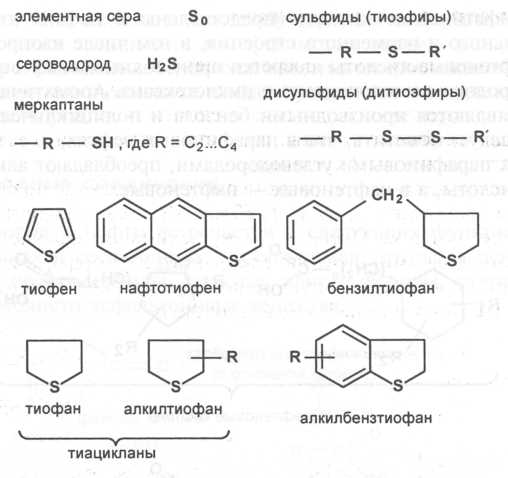 За некоторым исключением с повышением содержания серы в нефтях возрастают их плотность, коксуемость, содержание смол и асфаль- тенов. Распределение серы по отдельным фракциям зависит от природы нефти и типа сернистых соединений. Обычно содержание серы увеличивается от низкокипящих к высококипящим фракциям и достигает максимума в остатке от вакуумной перегонки нефти. Типы сернистых соединений в нефти весьма разнообразны. Отдельные нефти содержат свободную серу, которая при длительном их хранении выпадает в резервуарах в виде аморфной массы. В других случаях сера находится в нефтях и нефтепродуктах в связанном состоянии: в виде сероводорода и сероорганических соединений (меркаптанов, сульфидов, дисульфидов, тиофенов, тиофанов). В сернистых соединениях нефтей и нефтяных фракций различают три группы. К первой группе относятся сероводород и меркаптаны. В природных нефтях сероводород (H2S) присутствует в небольших количествах [0, 01—0, 03 %(мас.)] в растворенном состоянии. Основное его количество уходит с попутным газом, добываемым вместе с нефтью. При переработке сернистых нефтей за счет термических и термокаталитических реакций деструкции образуется большое количество сероводорода, который выделяют из газов и направляют на производство серы и серной кислоты. Меркаптаны (RSH) содержатся в нефтях в небольших количествах, и их общее содержание обычно составляет 2—10 % (мае.) от всех серосодержащих соединений нефти. Одним из характерных свойств меркаптанов является их коррозионная активность, в связи с чем содержание меркаптановой серы в авиационном керосине и дизельном топливе ограничивается (не более 0, 001—0, 005 и 0, 01% мае. соответственно). В бензинах они ухудшают антидетонационные свойства, химическую стабильность и уменьшают полноту сгорания. Меркаптаны имеют очень сильный и неприятный запах, ощущаемый уже при концентрациях 1 • 10 7 %. Это их свойство используется в газовых хозяйствах, где они применяются в качестве одорантов (этил- меркаптан) для обнаружения утечки бытового газа. Неприятный запах меркаптанов уменьшается с повышением их молекулярной массы. На способности меркаптанов взаимодействовать со щелочами и металлами основаны промышленные процессы их удаления из легких фракций нефти (демеркаптанизация). Ко второй группе относятся нейтральные на холоду и термически малоустойчивые сульфиды (R-S-R' алифатические, Ar-S-Ar диарил- сульфиды или Ar-S-R смешанные) и дисульфиды (R-S-S-R'). Сульфиды обладают более слабым запахом, чем меркаптаны, они нейтральны и поэтому щелочью не извлекаются. По своему строению сульфиды являются аналогами простых эфиров. Они также склонны к окислению, и это их свойство используется для получения сульфоксидов. Дисульфиды в нефтях содержатся в небольших количествах, но они более реакционноспособны, чем сульфиды. При нагревании легко разлагаются на углеводород, меркаптан и сероводород. В третью группу сернистых соединений входят химически малоактивные, стойкие к окислению, термически стабильные циклические соединения — тиофаны и тиофены. Типичное соотношение перечисленных серосодержащих соединений в нефтях различных месторождений составляет: меркаптаны 2— 10 %, сульфиды 7—40 % (в среднем 18 %), тиофены 50—90 % (в среднем 50 %). Кроме перечисленных выше представителей серосодержащих соединений в высококипящих