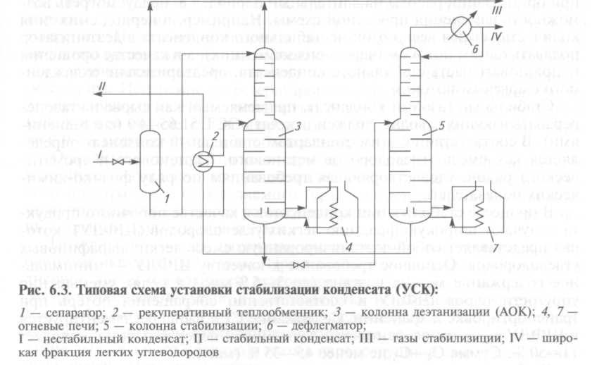 дожатая в компрессорах направляют в магистральный газопровод. Стабилизацию деэтанизированного конденсата осуществляют в колонне стабилизации 5. При этом с верха колонны отбирают пропан-бутано- вую фракцию (ПБФ) III либо широкую фракцию легких углеводородов (ШФЛУ) IV, а с низа колонны отводят стабильный конденсат II. Для подвода тепла в низ колонн используют огневые печи 4, 7. Давление в деэтанизаторе составляет 1, 9—2, 5 МПа, давление в стабилизаторе — 1, 3-1, 6 МПа. Стабильный конденсат определяется как смесь углеводородов метанового, нафтенового и ароматического рядов, удовлетворяющая требованиям по ряду физико-хими- ческих показателей. В процессе стабилизации конденсатов в качестве побочного продукта получают широкую фракцию легких углеводородов (ШФЛУ), которая представляет собой деэтанизированную смесь легких парафиновых углеводородов. Основное требование к качеству ШФЛУ — минимальное содержание метана и этана (до 3—5 % мае.) в целях сокращения потерь при транспортировке и хранении. Стабилизацию сернистых конденсатов осуществляют по схемам, аналогичным схемам УСК бессернистых конденсатов. Отличие заключается в их аппаратурном оформлении и параметрах режима, а также в необходимости ингибирования процесса коррозии в отдельных узлах установки. Основные отличия УСК сернистых конденсатов относятся к переработке выделенных из нестабильного конденсата газовых потоков. Главное требование — это отсутствие сероводорода в стабильном конденсате. Реализация получаемых из сернистых конденсатов серы и меркаптанов зачастую окупает все расходы на очистку конденсата и позволяет с максимальной эффективностью эксплуатировать газоконденсатные месторождения.