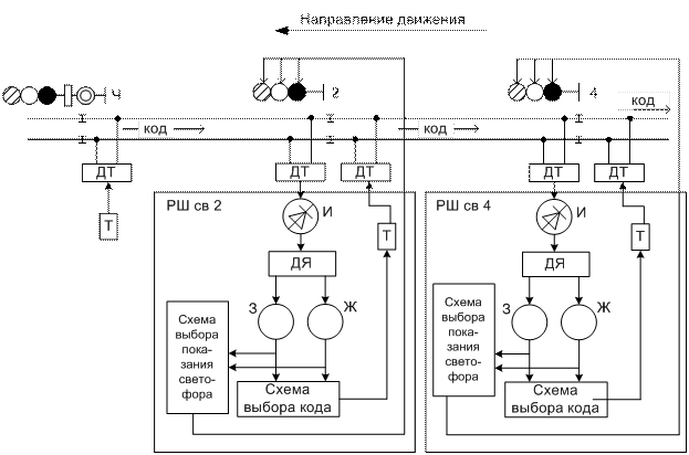 На участках с электрической тягой применяется числовая кодовая автоблокировка переменного тока. Характерные особенности ее следующие: для питания рельсовых цепей используется переменный ток частотой 50 Гц (при электротяге постоянного тока) и 25 Гц (при электротяге переменного тока); применение только импульсных рельсовых цепей с путевым импульсным реле на входном конце рельсовой цепи; импульсное питание рельсовых цепей осуществляется кодовыми сигналами, общими для автоблокировки и локомотивной сигнализации; увязка сигнальных показаний смежных попутных сигналов осуществляется с помощью кодовых сигналов; установка в рельсовых цепях дроссель-трансформаторов; использование линзовых постоянно горящих светофоров. Работу кодовой автоматической блокировки поясняет структурная схема (рис. 2.32). От светофора «Ч» ток в виде импульсов переменного тока поступает через дроссель-трансформатор ДТ на путевое реле И. Реле П срабатывает от каждого принятого импульса и своим контактом управляет работой дешифраторной ячейки ДЯ, которая считает количество импульсов между удлиненными паузами и тем самым расшифровывает принимаемый код. После дешифрации кода включаются реле Ж и З в зависимости от того, какой код принимается и на светофоре 2 включается соответствующий огонь (схема выбора кодов), также формируется код для посылки его в следующие рельсовые нити посредством КПТШ (кодовый путевой трансмиттер) и трансмиттерного реле Т блок – участка, расположенного за светофором 2 аналогично как от светофора Ч.
