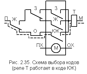 – Схема выбора кода состоит из контактов сигнальных реле З и Ж, а также огневого реле. Если на сигнальной точке горит красный огонь, то оба реле З и Ж обесточены, трансформаторное реле подключено через шайбу КЖ трансмиттера, при этом в рельсовую линию посылается код красно-желтого огня (рис. 2.35).