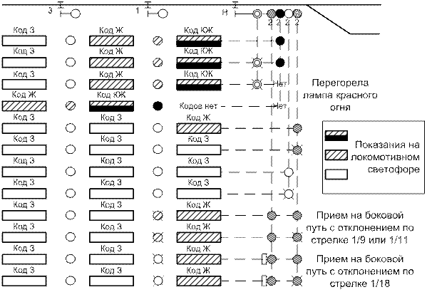 Рис. 2.37. Увязка между показаниями путевых и локомотивных светофоров при числовой системе АЛС