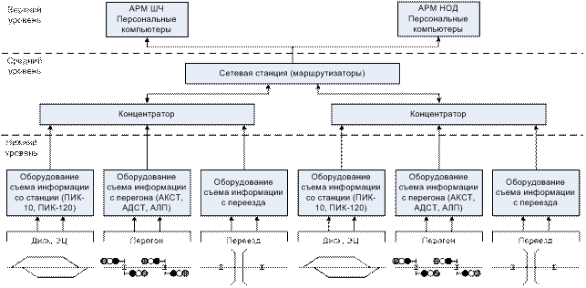 Подсистема нижнего уровня состоит из специализированных контроллеров, обеспечивающих съем и первичную обработку информации, снимаемой с устройств железнодорожной автоматики. Контроллеры работают с аналоговыми сигналами, снимаемыми с путевых реле, питающих фидеров, рабочих цепей стрелочного электродвигателя, и дискретными сигналами, снимаемыми с контактов реле, кнопок или индикаторов пульта-табло ЭЦ. В подсистеме нижнего уровня можно выделить устройства сбора информации с перегонных и станционных объектов. Состояние перегонных устройств систем железнодорожной автоматики контролируют автоматы контроля сигнальной точки (АКСТ). Контроллеры предназначены для съёма и кодировки информации о состоянии устройств автоматики и поездном положении на перегоне и устанавливаются в релейном шкафу. В качестве приемной аппаратуры линейного пункта используется приёмник СЧД (селектор частот демодулирующий), который предназначен для приема, выделения, демодуляции и вывода кодированной информации, передаваемой по многоканальной линии связи с частотным уплотнением от контроллеров перегонных объектов АКСТ, в концентратор среднего уровня АПК-ДК. Для съема информации со станционных устройств в системе АПК-ДК используются специальные приборы ПИК-10 и ПИК-120, выполненные на основе программируемых индустриальных контроллеров. Программируемый индустриальный контроллер ПИК-10 имеет 10 аналоговых и 10 цифровых входов, и предназначен для: · измерения средних значений напряжений сигналов переменного тока поступающего на аналоговые дифференциальные входы; · измерения сопротивления изоляции электрических цепей (кабель, монтаж и т.д.) контролируемых объектов · преобразования в стандартный цифровой вид сигналов переменного и постоянного напряжения, поступающих на цифровые входы; · передачи измеренных значений напряжений и сопротивления изоляции в виде последовательного цифрового кода в концентратор по его запросу; · передачи, полученного в результате преобразования, состояния дискретных датчиков в цифровом коде в концентратор по его запросу. Программируемый индустриальный контроллер ПИК-120 имеет 120 цифровых входов и осуществляет съем информации с табло или свободных контактов реле. Контроллер ДИСК предназначен для съема информации с аппаратуры контроля нагрева букс на ходу поезда (ДИСК, КТСМ). Средний уровень системы состоит из концентраторов первичной обработки информации на линейных пунктах. Это промышленные компьютеры, по одному на каждую станцию, которые собирают информацию от подсистемы нижнего уровня и обеспечивают обработку, хранение, архивацию и её передачу другим концентраторам, а также передают полученные сведения на верхний уровень. Информационное и программное обеспечение среднего уровня позволяет организовать вычислительную сеть на станции и осуществить объединение локальные вычислительные сети нескольких станций. Верхний уровень состоит из технических средств автоматизированных рабочих мест (АРМов) диспетчера дистанции, поездных диспетчеров, энергодиспетчера, старшего электромеханика поста ДЦ и других пользователей. Он обеспечивает передачу информации в сеть отделения дороги, а также связь системы АПК-ДК с другими комплексными автоматизированными системами управления (АСОУП и АСУ-Ш).