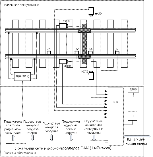 2.5.2. Системы контроля подвижного состава Развитие и совершенствование систем диагностики подвижного состава на ходу поезда предполагает: расширение функциональных возможностей систем при повышении качества принятия решений и улучшении информационного обеспечения эксплуатационного штата; объединение отдельных систем в единую информационную сеть, а также разработку и применение новых методов и технических средств. Это позволит отслеживать динамику изменения технического состояния подвижного состава, своевременно обнаруживать и устранять неисправности, обеспечить обслуживающему персоналу доступ к оперативной информации в реальном времени. С таким подходом создаются комплексные автоматизированные системы диагностирования подвижного состава, включающие системы различного функционального назначения, такие как ПОНАБ, ДИСК, КТСМ, КРАП. К перспективным техническим средствам для создания систем диагностирования подвижного состава относится комплекс технических средств КТСМ-02, предназначенный для обнаружения неисправностей буксовых узлов, колесных пар, тормозного и автосцепного оборудования, волочащихся деталей, нарушения габарита и др. Структурная схема комплекса показана на рис. 2.42. КТСМ состоит из напольного, постового и станционного оборудования. В состав напольного оборудования входят: · две основные и две вспомогательные напольные малогабаритные камеры КНМ (левые НКЛО, НКЛВ и правые НКПО, НКПВ), которые определяют температуру нагрева буксового узла; · датчики прохода осей Д1...Д4, по сигналам которых БПК осуществляет счет осей и подвижных единиц в контролируемом поезде, определяет тип подвижных единиц; · рельсовая цепь наложения РЦН (электронная педаль ЭП-1) служит для контроля наличия поезда. В состав постового оборудования входят: блок преобразования и контроля БПК, блок силовой коммутационный БСК, технологический пульт ПТ, а также датчик температуры наружного воздуха ДТНВ. Блок БПК выполняет следующие функции: преобразует и обрабатывает сигналы от путевых датчиков, формирует и передает подсистемам контроля управляющие сигналы, получает от этих подсистем данные об аварийных подвижных единицах и передает собранную информацию в линию связи. Кроме этого, БПК вырабатывает сигналы управления и диагностики состояния оборудования, работающего в составе комплекса. В блоке имеются средства тестирования и настройки комплекса персоналом в процессе технического обслуживания (технический пульт ПТ). Микропроцессорная система блока обеспечивает работоспособность напольных камер независимо от температуры окружающей среды и автоматически контролирует приемно-усилительные тракты.