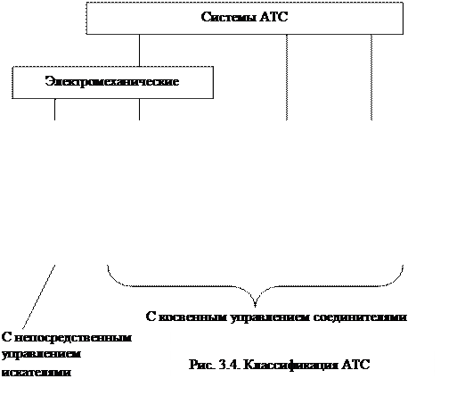 Разговорная схема в телефонном аппарате выполняет несколько важных функций. Во-первых, она преобразует сигналы, передаваемые по четырем проводникам шнура микротелефонной трубки (два провода для передатчика и два провода для приемника), в сигналы двухпроводной (tip и ring) телефонной линии – эта функция называется гибридной. Во-вторых, разговорная схема обеспечивает передачу сигналов номеронабирателя в телефонную линию. Наконец, эта схема автоматически компенсирует изменения длины телефонной линии, поддерживая громкость речи, воспроизводимой приемником, на постоянном уровне. В электронных телефонах, кроме того, имеются усилители для повышения уровней сигналов передатчика и приемника. В старых механических телефонах для построения разговорной схемы использовались громоздкий трансформатор и дискретные компоненты, в электронных телефонах вся разговорная схема зачастую собрана на одной интегральной схеме, осуществляющей фильтрацию сигнала, компенсацию длины линии и переход с двухпроводной телефонной линии на четырехпроводную (именно для реализации последней функции и использовался трансформатор). 3.3. Классификация телефонных станций Телефонная станция представляет собой комплекс устройств, которые обеспечивают временные (существуют между абонентами только на время разговора) соединения между абонентскими телефонными аппаратами. Телефонные станции можно классифицировать по следующим признакам: 1) по области применения - местные и междугородные. Местные телефонные станции обеспечивают соединения между телефонными аппаратами, располагаемыми в пределах территории населенного пункта, железнодорожного узла, станции, а междугородными - между абонентами, удаленными друг от друга на большие расстояния (в разных городах); 2) по типу применяемых искателей и соединителей (рис. 3.4): - электромеханические, в которых применяются электромеханические искатели и соединители; - квазиэлектронные, в которых соединители построены на герконовых реле, а управляющие устройства - на электронных элементах; электронные, в которых соединители и управляющие устройства построены на электронных элементах; 3) по методу управления процессом соединения: - непосредственное управление искателями (декадно-шаговые АТС); - косвенное управление искателями (координатные, квазиэлектронные, электронные). АТС с непосредственным управлением искателями характеризуется тем, что импульсы набора номера, посылаемые абонентом, воздействуют на управляющее устройство искателя (рис. 3.5), которое непосредственно управляет движением щеток по контактному полю. Благодаря этому процесс коммутации осуществляется одновременно с набором номера. Непосредственное управление искателями применяется в АТС декадно-шаговой системы, где для каждого искателя имеется индивидуальное управляющее устройство, состоящее из релейного комплекта и движущихся электромагнитов.