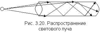 Для связи по световодам используются видимые лучи (0, 4…0, 75 мкм) и ближний диапазон инфракрасных лучей (0, 85; 1, 3; 1, 55 … 6 мкм). При этом возможна передача большого числа различных типов волн-мод (m). Исходя из двойственной природы света (лучевой и волновой) различным типам волн – модам соответствует различное число лучей. Одномодовой передаче соответствует один луч (рис. 3.22, а), а многомодовой, например, три (рис. 3.22, б).
