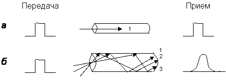 Рис. 3.22. Режимы распространения отпического излучения по световоду: а – одномодовый; б – многомодовый