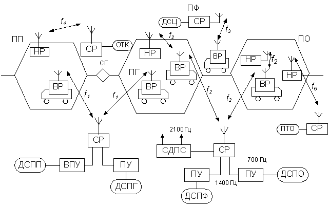 В первом маневровом районе, включающем ПП надвижную часть горки и подгорочную горловину (ПГ), происходят расформирование поездов и операции по частичному формированию составов. Руководит работой дежурный по сортировочной горке ДСПГ, в помещении которого устанавливается стационарная радиостанция (СР), с двумя пультами, управления. Один – у ДСПГ, дугой (выносной) у дежурного по парку приема ДСПП. Горочные локомотивы оборудованы возимыми радиостанциями (ВР), которые вместе с радиостанцией ДСПГ образуют сеть горочной радиосвязи с рабочей частотой f1. Вызов абонентов осуществляется голосом без предварительной посылки вызывных сигналов. Во втором маневровом районе, включающем ПФ и ПО, происходит окончательное формирование составов. Общее руководство маневровой работой осуществляет дежурный по парку формирования ДСПФ, в помещении которого установлена СР. Перемещением маневровых локомотивов, оборудованных ВР, непосредственно руководят составители поездов, имеющие носимую радиостанцию (НР). Дежурный по парку отправления ДСПО подключается с СР с помощью выносного пульта управления. Часто в распоряжении руководителя маневров, кроме СР, имеется система громкоговорящей связи. Все радиостанции рассматриваемого маневрового района работают на одной частоте f2 и образуют сеть маневровой радиосвязи. В сети используется, как правило, групповой избирательный вызов. Сигнал с частотой В третьем маневровом районе, включающем всю территорию станции, выполняются работы с местными вагонопотоками, например операции по доставке вагонов под погрузку и выгрузку. Руководит работами дежурный по станции, в распоряжении которого имеется СР для передачи информации машинистам хозяйственных локомотивов. При этом образуется вторая сеть маневровой радиосвязи с рабочей частотой f3. Кроме сетей маневровой и горочной радиосвязи, система СРС включает в себя несколько сетей радиосвязи персонала, занятого обработкой составов на станциях. Система станционной радиосвязи строится по радиальному принципу, и стационарные станции оборудуются широко направленной антенной. Применение системы СРС позволяет ускорить обработку составов на сортировочных горках, сократить непроизводительный простой вагонов и локомотивов, а, следовательно, увеличить пропускную способность станции.