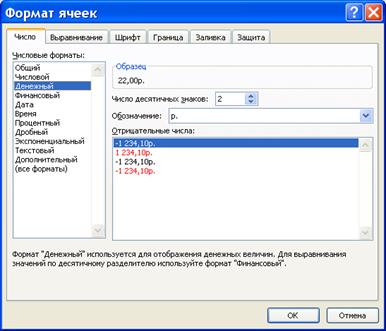 Вы можете по своему усмотрению настраивать представление данных в любой ячейке либо диапазоне, то есть форматировать активную ячейку или выделенный диапазон. Чтобы перейти в данный режим, выполните команду Формат ячеек. Откроется окно, которое содержит несколько вкладок: Число, Выравнивание, Шрифт, Граница, Заливка и Защита. Кратко остановимся на каждой из них. На вкладке Число выбирают подходящий числовой формат ячейки (диапазона), а также настраивают параметры выбранного формата. Пример того, как будет выглядеть содержимое ячейки (диапазона) при текущих настройках, вы можете увидеть в поле Образец.