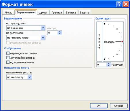 Вкладку Выравнивание используют, для того чтобы настроить отображение данных в ячейке. В области Выравнивание осуществляют горизонтальное и вертикальное выравнивание содержимого ячейки; подходящие варианты выбирают из раскрывающихся списков по горизонтали и по вертикали. Если в поле по горизонтали выбрано значение по левому краю (отступ), то для редактирования становится доступным расположенное правее поле отступ, в котором указывают необходимую величину отступа.