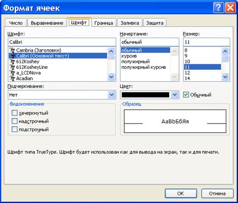 В области Ориентация устанавливают требуемый вариант ориентации текста ячейки (например, можно расположить текст в ячейке вертикально либо под произвольным углом). В области настроек Отображение есть три флажка. Если вы установите флажок переносить по словам, то вводимый в ячейку текст будет автоматически переноситься на следующую строку при достижении правого края ячейки. Установка флажка автоподбор ширины позволяет уменьшить размер символов шрифта таким образом, чтобы содержимое ячейки помещалось в столбце. Для объединения двух или более ячеек в одну установите флажок объединение ячеек (предварительно следует выделить объединяемые ячейки). Настройку шрифта ячейки или диапазона выполняют на вкладке Шрифт. Здесь указывают подходящий стиль шрифта, выбирают его начертание и размер. В поле Образец вы можете увидеть, как будет представлено содержимое ячейки при текущих настройках.