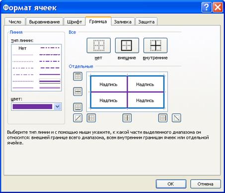 На вкладке Граница настраивают отображение границы ячейки (диапазона). В области Линия, которая находится в левой части вкладки, щелчком кнопкой мыши задают подходящий тип линии границы и из раскрывающегося списка выбирают ее цвет. В правой части вкладки указывают область применения границы. По умолчанию границы ячеек не отображаются.