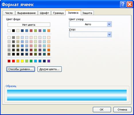 На вкладке Заливка вы можете указать цвет фона ячейки (диапазона), а также выбрать узор, которым будет оформлена ячейка (диапазон). В поле Образец можно видеть, как будет выглядеть ячейка (диапазон) при текущих настройках.