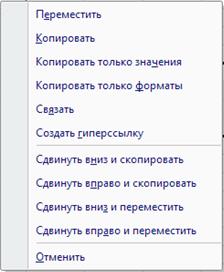 Чтобы быстро переместить ячейку (или диапазон ячеек) на новое место, достаточно ее выделить и перетащить левой кнопкой мыши. Следует сказать, что " захватывать" выделенные ячейки следует за жирный контур, окаймляющий диапазон. При перетаскивании появляется серая рамка, которая позволяет правильно разместить диапазон. Когда серая рамка окажется над нужными ячейками, надо отпустить кнопку мыши. Чтобы скопировать и вставить выделение, не перемещая его, перед тем как отпустить кнопку мыши, надо нажать клавишу Ctrl. Рядом с указателем мыши при этом появится значок " плюс". С помощью мыши можно также вставлять ячейки в рабочий лист. При этом надо удерживать нажатой клавишу Shift. При этом, рядом с указателем мыши выводится экранная подсказка с новым адресом ячеек. Нажимать и отпускать клавишу Shift надо обязательно до и после нажатия кнопки мыши. Можно также пользоваться обычными приемами копирования и вставки. Эти приемы можно использовать для выделения целых строк или столбцов и последующего их перемещения или копирования в новые места. Если выделить ячейки и затем перетащить любую границу прямоугольника выделения (но не за маркер заполнения) при нажатой правой кнопке мыши, то когда кнопка будет отпущена, на экране появится контекстное меню. Команды этого меню можно использовать при работе с выделенными ячейками несколькими способами.
