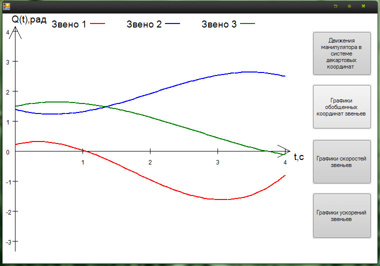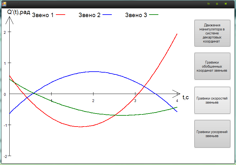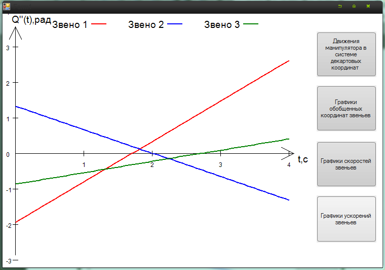 Рисунок 5.6. Графики ускорений звеньев. ЛИТЕРАТУРА 1. К. Фу, Р. Гонсалес, К. Ли. Робототехника. - М.: Мир, 1989. - 624 с. 2. М. Шахинпур. Курс робототехники. - М.: Мир, 1990.- 527 с. 3. Механика промышленных роботов. Под ред. К.В. Фролова, Е.И. Воробьева. Кн. 1. Кинематика и динамика. - М.: Высшая школа, 1988. - 304 с. 4. Г. Корн, Т. Корн. Справочник по математике. - М.: Мир, 1974. - 832 с. 5. Шилдт Г. С# 4.0: полное руководство.: Пер. с англ. — М.: ООО " И.Д. Вильяме", 2011. — 1056 с.: ил. — Парал. тит. англ. 6. Околов А.Р. Математическое обеспечение промышленных роботов: учебно-методический комплекс для студентов специальности 1-53 01 06 «Промышленные роботы и робототехнические комплексы»: в 2 ч./ А.Р.Околов, Е.Р.Новичихина, Г.С.Свидерский. – Минск: БНТУ, 2012. – Ч.1: Лабораторные работы. – 80 с. Содержание 1. Тематика курсовой работы………………………………..……3