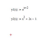 В левом верхнем углу рабочего листа виден красный крестик. Он указывает место, где будет произведена первая запись. Если это место Вас не устраивает, щелкните левой кнопкой мыши в любое место экрана. Крестик переместится туда. 2. Для того, чтобы записать формулу на рабочем листе программы нужно указать название первой функции y1(x), напечатав на экране y1(x), затем, с помощью оператора присваивания: = задать формулу.