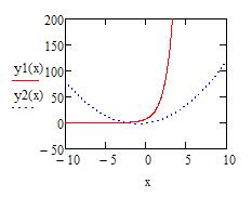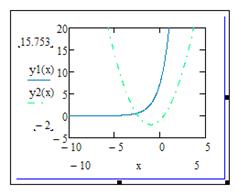 Задание 1: В двухмерной системе координат построить графики функций y1(x)=ex+2 и y2(x)=x2+2x-1 на промежутке [-10; 5], причем график функции y1(x)=ex+2 должен быть изображен непрерывной синей линией, а график функции y2(x)=x2+2x-1 – штрих-пунктиром зеленого цвета. Найти координаты точки пересечения графиков А и координаты пересечения графиков y1(x) и y2(x) с осью Oy – точки В и С соответственно. Будут ли графики пересекать ось Оx? Если да, то укажите координаты точек пересечения. Технология выполнения задания: 1. Запустите программу Mathcad.