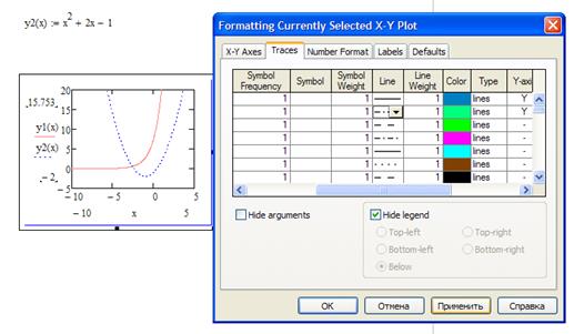 В первой строке запись «trace 1» соответствует графику y1(x), а «trace 2» – графику y2(x).