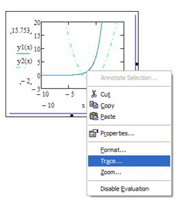 6. Найдем координаты точек А, В и С. Для этого правой кнопкой мыши щелкнем по любому графику и в появившемся меню выберем строку «Trace».