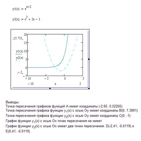 В первых двух рамках будут появляться координаты x и y точек, попадающих в перекрестие. Удерживая левую кнопку мыши, можно изменять его положение. Проведя такое действие получим, что А (-2, 65; 0, 52205), В (0; 7, 3891), С (0; -1). Также можно установить, что график функции y1(x)=ex+2 точек пересечения с осью Ох не имеет, а график функции y2(x)=x2+2x-1 имеет две точки пересечения D(-2, 41; -0, 0119) и E(0, 41; -0, 0119). Понятно, что значение будет настолько точным, насколько точно удалось совместить центр перекрестия с интересующей нас точкой. 7. Запишем получившиеся данные с пояснениями на рабочий лист программы. Получим:
