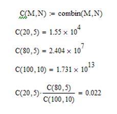 Задание 2: Пусть в группе из N =100 студентов M =20 – круглые отличники. Внешней комиссией для последующего тестирования отбирается n =10 студентов. Какова вероятность того, что среди отобранных студентов число отличников будет равно m =5? Решение: Предположим, что мы перенумеровали всех студентов. тогда общее число групп из n=10 человек будет определяться числом сочетаний из 100 по 10: Вычисление вероятности в Mathcad будет выглядеть так: