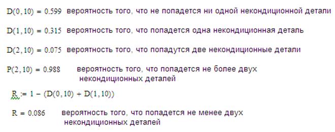 Вероятность появления k раз события A в серии n независимых испытаний равна: · Вероятность того, что событие A произойдет не более чем k раз. Обозначим Pn (k) вероятность того, что событие A произойдет не более чем k раз в n испытаниях, т.е. появится или 0, или 1, или 2, или 3, …, или k раз. Тогда вероятность Pn (k) будет равна сумме первых k членов формулы Бернулли: Pn (k)= · Вероятность того, что событие A произойдет не менее чем k раз. Rn(k) = · Вероятность того, что событие A произойдет хотя бы одинраз. Rn(1) = · Вероятность того, что событие A произойдет не более одногораза. Pn (1)= В Mathcad значения вероятностей по формуле Бернулли выводит встоенная функция dbinom(k, n, p), кумулятивные вероятности вычисляются функцией pbinom(k, n, p). Задание 3: В процессе проверки качества деталей на контроль взято 10 деталей, из которых наугад осуществляется выборка отдельных деталей с возвращением в контрольную группу после проверки. Доля некондиционных деталей во всей партии равна 0, 05. Каковы вероятности обнаружить в контрольной группе: а) некондиционные детали; б) не более двух некондиционных деталей; в) не менее двух некондиционных деталей? Решение: По условию задачи k =2, n =10, p =0, 05, q =1- p =0, 95. Вероятность обнаружить 2 некондиционные детали из 10 вычисляется по формуле: Ответ на второй вопрос задачи дает формула для кумулятивной вероятности: Pn (k)= P10 (2)= 0, 599+0, 315+0, 075=0, 988. Для ответа на третий вопрос воспользуемся формулой: Rn(k) = R10(2) =1-[P10(0)+P10(1)]=0, 086. При решении этой задачи в Mathcad по формуле Бернулли вычисляется P10 (2). Прямые вычисления сопровождаются применением функций dbinom и combin.