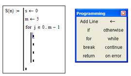 · while – инструкция задания цикла, действующего до тех пор, пока выполняется некоторое условие; · break – инструкция прерывания; · continue – инструкция продолжения; · return – инструкция возврата; · on error – инструкция обработки ошибок. 4. Продолжим написание программы. Для того, чтобы присвоить переменной s ее локальное значение выполним следующие действия: «(», «/», появится шаблон, который необходимо заполнить