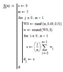 Задание1: Проиллюстрируем процесс стабилизации относительных частот при увеличении числа испытаний на примере идеализированного эксперимента, имитирующего бросание монеты. Предположим, что в эксперименте осуществляется бросание монеты n раз; эксперимент повторяется 5 раз. Технология выполнения задания: Необходимо создать циклическую процедуру имитации результатов бросания. В качестве генератора результатов эксперимента используем генератор независимых случайных чисел (встроенная функция runif) с равномерным распределением в диапазоне (0, 49, 0, 51), данные которого округляются до ближайшего целого (0 или1) с применением встроенной функции round. 1. Обозначим результат эксперимента функцией S(n), которая будет задаваться программой:
