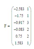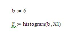 В практических задачах при объемных массивах данных статический ряд необходим гораздо реже, чем группированный статистический ряд. Группированным статистическим рядом называют совокупность середин промежутков и соответствующих им частот попаданий значений в данный промежуток. Наглядное представление о группированном статистическом ряде можно получить, составляя гистограмму. Гистограммой называется график, аппроксимирующий по выборочным данным плотность эмпирического распределения. При построении гистограммы область наблюдаемых значений случайной величины разбивается на n равных интервалов и подсчитывается количество попаданий данных в каждый интервал. В Mathcad для построения гистограммы используется функция histogram(b, X). Пусть данные о выборке составляют матрицу-столбец X, а X1 – столбец значений матрицы X, расположенных в порядке возрастания. Пусть число промежутков b будет равно 6. Тогда зададим матрицу F, первый столбец которой будет состоять из середин промежутков разбиения, а второй – из количества значений попавших в этот промежуток.