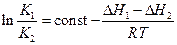E 1 = E 2 – 19 = 61 кДж/моль. Аналогичные расчёты, но с термодинамическими величинами, можно провести для равновесных концентраций. Обозначим энтальпии первой и второй прямых реакций D H 1 и D H 2. Из зависимости константы равновесия от температуры следует: