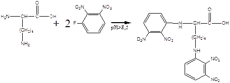 б) реакция лизина с альдегидами приводит к образованию основания Шиффа и тоже протекает по двум аминогруппам: