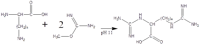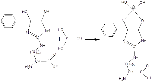 При взаимодействии фенилглиоксаля с аргинином, карбонилы реагируют с гуанидо-группой аргинина: