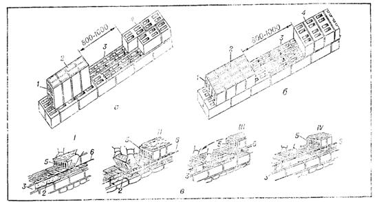 Кладка из природных камней правильной формыПрименение мелких блоков. Природные и искусственные камни правильной формы для мелкоблочной кладки должны иметь размеры и массу, допускающие их укладку вручную. Среднюю толщину швов принимают такой же, как при кирпичной кладке (горизонтальных — 12, вертикальных — 10 мм).Кладки из природных и бетонных камней. При кладке из пильных известняков-ракушечников и туфов вертикальные поперечные швы надо перевязывать тычковыми рядами в каждом втором, а из бетонных сплошных и пустотных камней — не реже чем в каждом третьем ряду. Бетонные камни с несквозными пустотами кладут отверстиями вниз. Рис. VI.7. Кладка из бетонных и керамических камней: а — кладка ложкового ряда из бетонных камней; б—то же, тычкового ряда; в — кладка из керамических камней; I—IV— последовательность кладки керамических камней тычкового ряда; 1, 4 —камни, подготовленные для кладки ложкового и тычкового рядов; 2 — постель из раствора; 3 — уложенные камни; 5 — укладываемые камни; 6 — причалка. Укладывая камни со сквозными пустотами, последние, если это предусмотрено проектом, засыпают сухими материалами и послойно уплотняют их штыкованием.Кладку из мелких блоков ведут на растворе подвижностью 9—13 см погружения стандартного конуса. Раствор для постели под сплошные камни подают специальным лотком, а под блоки с пустотами — ковшом, позволяющим укладывать раствор полосами.Мелкоблочная кладка, в зависимости от массы блоков (16—25 кг), ведется звеном «двойка» или «тройка». Для образования вертикальных поперечных швов камни в процессе кладки раскладывают на стене так, чтобы поверхности, на которые наносят раствор, были наверху. Для ложкового ряда камни раскладывают стоймя, или на тычок (рис. VI.7, a), а тычкового — на ребро, т. е. на ложок (рис. VI. 7, 6). Раствор наносят на постель и верхние поверхности подготовленных к укладке камней. Каменщик укладывает камни двумя руками. Отделив камень от наверстанного ряда, каменщик подносит его к месту укладки и в ложковом ряду переводит из вертикального положения в горизонтальное, а в тычковом — поворачивает камень с ложка на постель, плотно прижимает к ранее уложенного и осаживает. Уложив несколько камней, он подрезает кельмой раствор, выступивший на лицевой стороне. Кладку из керамических пустотных камней выполняют с поперечной перевязкой вертикальных швов тычковыми камнями, укладываемыми не реже чем через три ряда по высоте стены. Подвижность раствора должна быть не менее 7—8 см погружения стандартного конуса. Для заполнения поперечных вертикальных швов в тычковых рядах раствор наносят на грани камней предварительно (до их укладки), а в ложковых рядах — в процессе кладки. При небольшом фронте работ (короткие простенки) кладку ведут звеньями «двойка» или «четверка». Во время кладки тычкового ряда (рис. VI.7, e) каменщик III разряда наверстывает камни на стену плашмя вплотную один к другому, подает и расстилает раствор на стене для постели и на наверстанных камнях для вертикальных швов. Каменщик IV разряда разравнивает раствор кельмой, затем двумя руками берет камень за торцовые грани, подносит к месту укладки и, повернув его на 90о, прижимает к ранее уложенному камню и осаживает (рис. VI.7, в, I—IV). При кладке ложкового ряда каменщик III разряда наверстывает камни и расстилает на стене раствор для постел