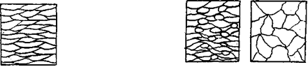Рис. 8. Схема изменения структуры наклёпанного металла при рекристаллизации. Этот процесс называется рекристаллизацией. Температура рекристаллизации имеет важное практическое значение и зависит от природы основного металла, наличия и количества легирующих элементов, степени предшествующей деформации. Ориентировочно эту температуру определяет по состоянии: