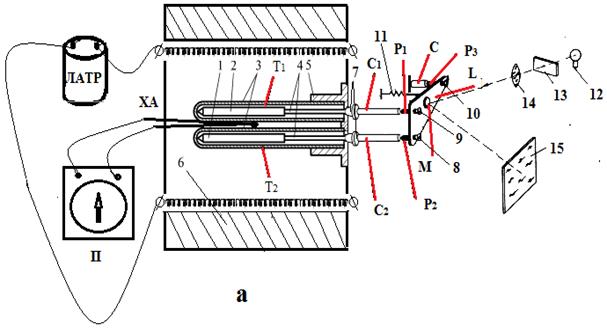 г д Рисунок 7.2 – Диференційний оптичний дилатометр типу Шевенара (а – принципова схема, б – кварцові трубки в муфті, в – головка дилатометра, г – піднятий оптичний трикутник, д – правильно встановлений оптичний важіль): 1 – зразок; 2 – еталон; 3 – кварцові трубки; 4 – кварцові штовхачі; 5 – муфта; 6 – електрична піч; 7 – припискаючі обмежувачі; 8 – 9 – 10 – мікрогвинти; 11 – притискаюча пружина; 12 – лампочка; 13 – блок діафрагм; 14 – конденсор; 15 – матове скло (фотопластина). Р2 оптичного важеля L, на якому укріплено увігнуте дзеркальце М з фокусною відстанню біля 1, 0 м. Стрижні С1 і С2 за допомогою обмежувачів 7 притискаються до кварцових штовкачів для усунення зазорів між зразками і оптичним важелем. Застосування сплаву типу «інвар» (Fe + 36 % Ni) обумовлено тим, що він в широкому інтервалі температур має незначний (0, 5÷ 1, 5·10-6 град-1) та постійний коефіцієнт термічного розширення. Оптичний важіль L являє собою прямокутний трикутник, виготовлений із сплаву типу «інвар» і має в кожному куті по мікроскопічному гвинту 8-10 з вістрями. Вістрям Р1 важіль спирається на плоску поверхню стрижня С1, вістрям Р2 – в заглиблення на стрижні С2 і вістрям Р3 – в опору з горизонтальною канавкою нерухомого блоку С. Оптичний трикутник притискається до опор С1, С2, С за допомогою пружини 11. При розширенні зразка або еталона оптичний важіль L під їх тиском відходить від свого початкового положення, а при їх скороченні - рухається в зворотному напрямку під дією пружини. Освітлювальний вузол складається з електричної лампочки 12, яка живиться від знижуючого трансформатора, конденсора 14, блока діафрагм 13, схема якого показана на рис. 7.3. Блок діафрагм 13 являє собою плоску пластину, в якій є діафрагма 3 діаметром 3 мм для юстування дилатометру, робоча діафрагма 4 діаметром 0, 15 мм і щільова діафрагма 2 шириною 0, 15 мм для нанесення позначок на дилатометричну криву (див. рис. 7.3, б). Остання откривається при включенні електромагнітного затвора 1.