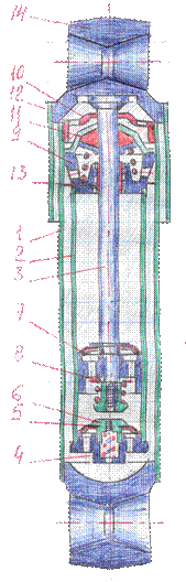 Назначение: Для гашения колебаний подвески, возникающих при движении по неровной дороге. Гидравлический, телескопический, двухстороннего действия. Шток верхней головки через резиновую втулку с пальцем соединен с кронштейном кузова. Нижняя головка соединена с накладкой рессоры. Рабочий цилиндр – 2 заполнен амортизаторной жидкостью АЖ – 12Т или веретенкой объемом 850 мл. Устройство: Корпус – 1, в котором установлен рабочий цилиндр – 2. В цилиндре перемещается шток с поршнем – 3. В поршне между корпусом и цилиндром установлены перепускные клапана – 7. В верхней части кожух, цилиндр закрыты резьбовыми крышками – 9, 10. Под крышками установлены сальники – 11. В отверстие крышки, по которой движется шток, вставлена бронзовая втулка – 13. К нижней части корпуса и к штоку приварены головки -14, для крепления. Верхняя часть штока закрыта пылезащитным кожухом – 12.