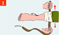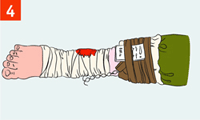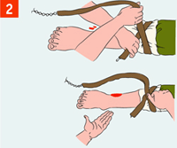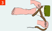| Закрепи палку бинтом во избежание ее раскручивания. Каждые 15 минут ослабляй жгут во избежание омертвения тканей конечности. Если кровотечение не возобновляется, оставь жгут распущенным, но не снимай его на случай возникновения повторного кровотечения.